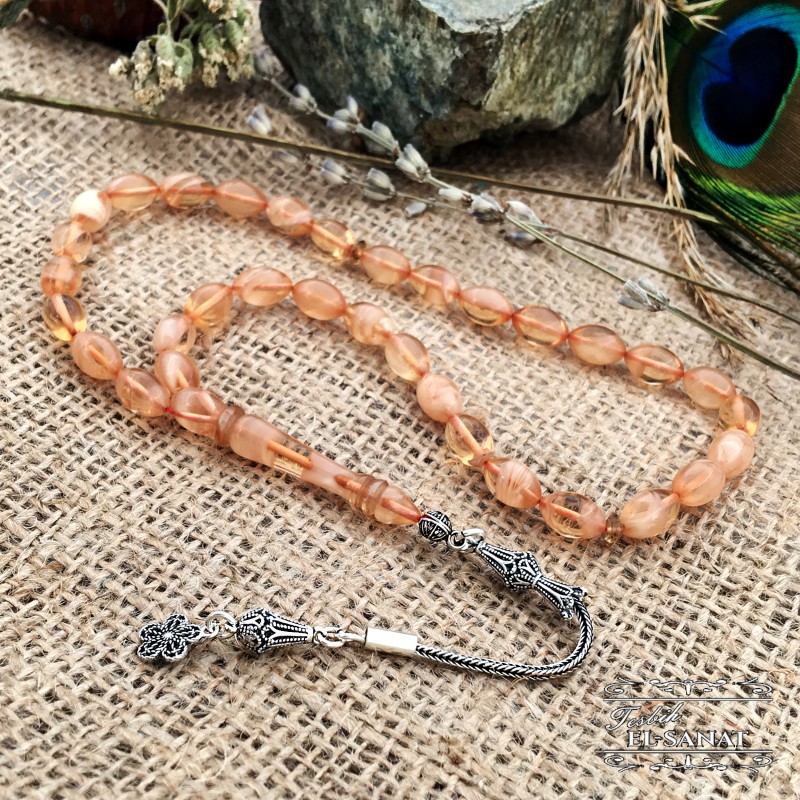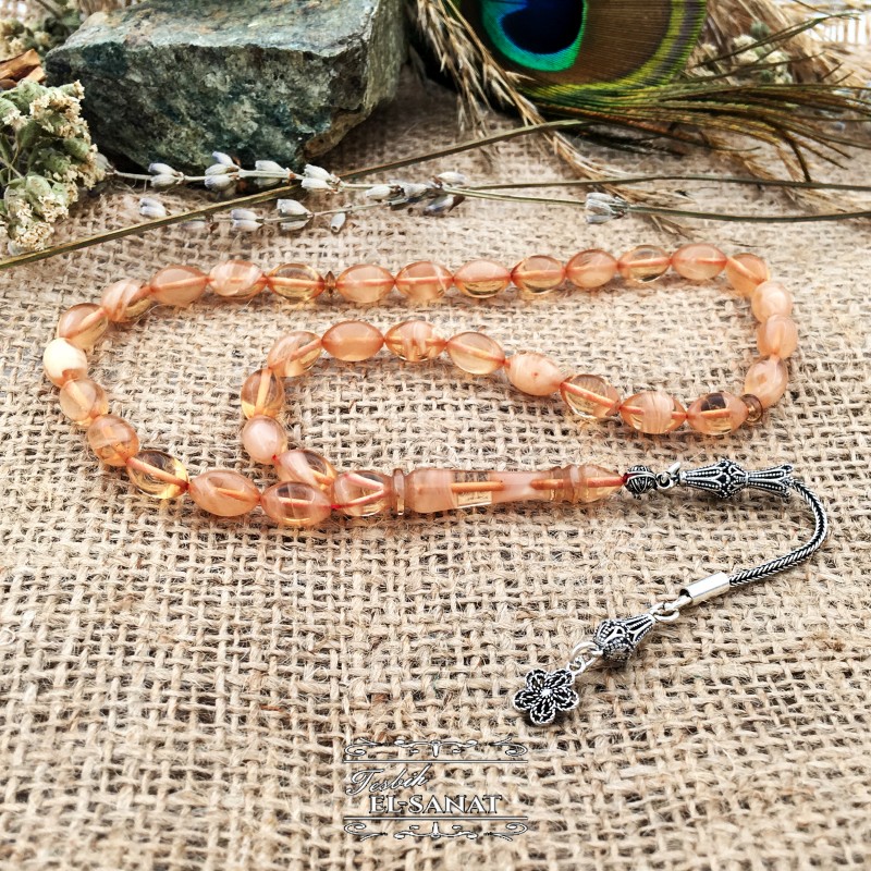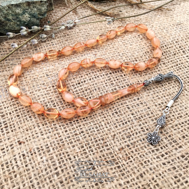 Arpa Kesim Damla Kehribar Gümüş Püsküllü Tesbih (7x11mm)